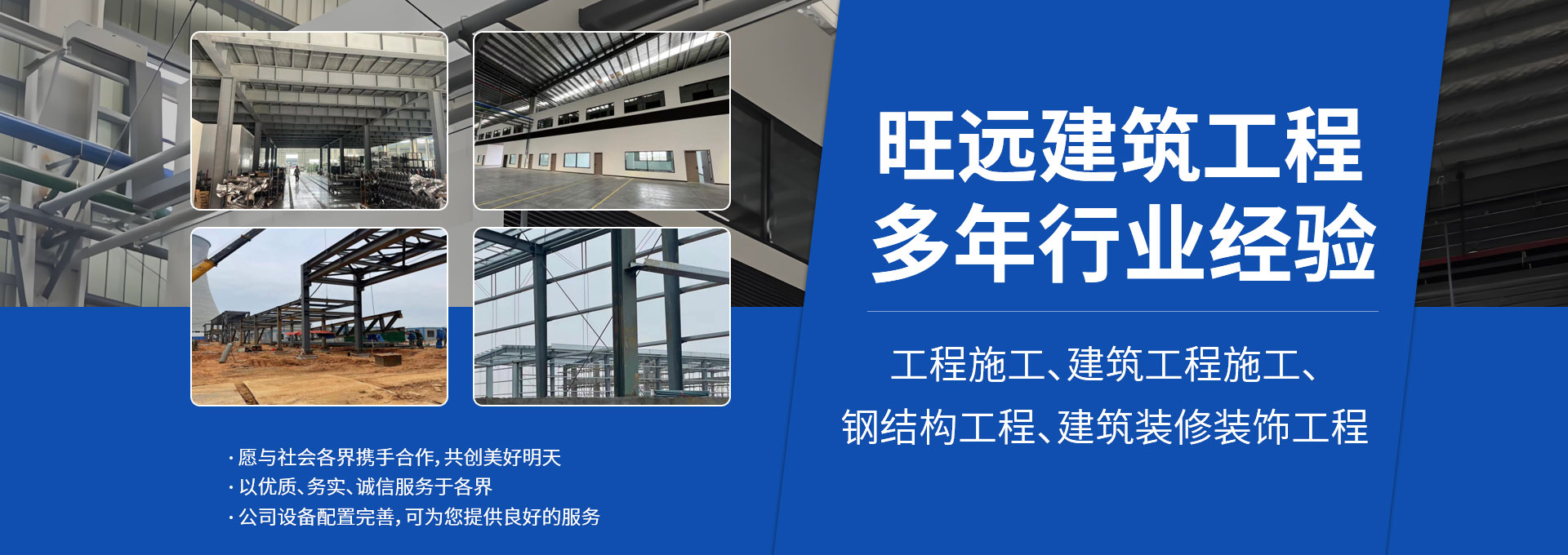 重慶旺遠建筑工程有限公司具備:建筑工程總承包貳級資質、鋼結構專業承包貳級資質、裝飾裝修專業承包貳級資質。業務可承接各種標準廠房總承包,辦公樓工程及廠房裝飾。鋼結構工程、鋼平臺夾層、樓層搭建,彩鋼大棚搭建、電梯井鋼結構、土建工程等。